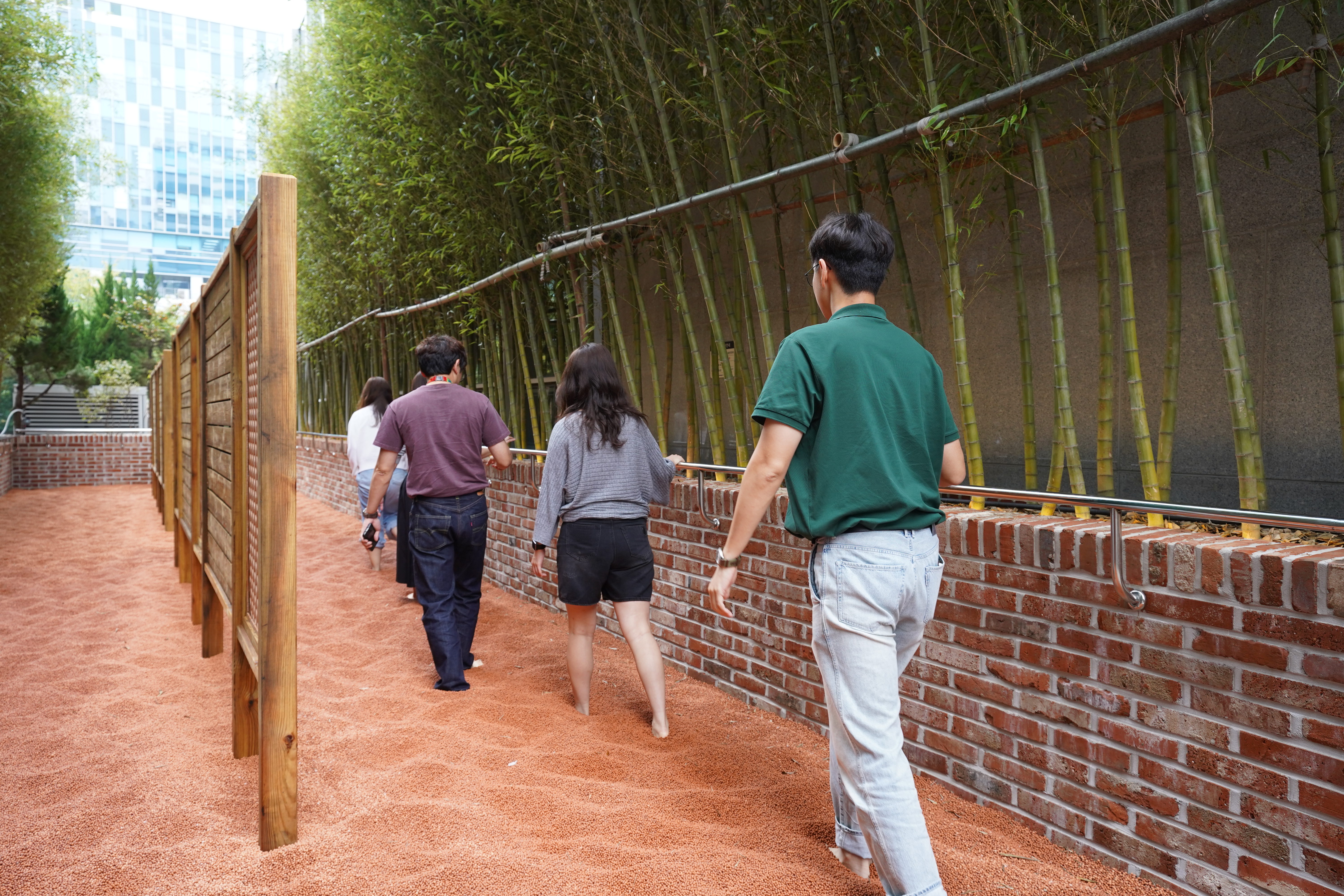 최근 스마일게이트 캠퍼스에 새로운 건강 산책로가 문을 열었습니다. 신발을 벗고 들어서면 발바닥에 전해지는 기분 좋은 자극, 바닥에는 황토볼이 깔려 있고 양옆으로는 대나무 숲이 그늘을 드리웁니다. 캠퍼스 옆 자투리 공간이 어느새 자연을 품은 '건강 스팟'으로 변신했습니다.바쁜 일상에서 잠시 벗어나 쉴 수 있는 이 길의 이름은 바로 '힐링로'. 구성원들의 건강한 일상을 위해 스마일게이트가 새롭게 조성한 황톳길입니다.스마일게이트 캠퍼스에 자리한 ‘스마일카페’ 왼편에 힐링로로 들어갈 수 있는 문이 새로 생겼는데요. 문을 열고 들어서면 왼편…